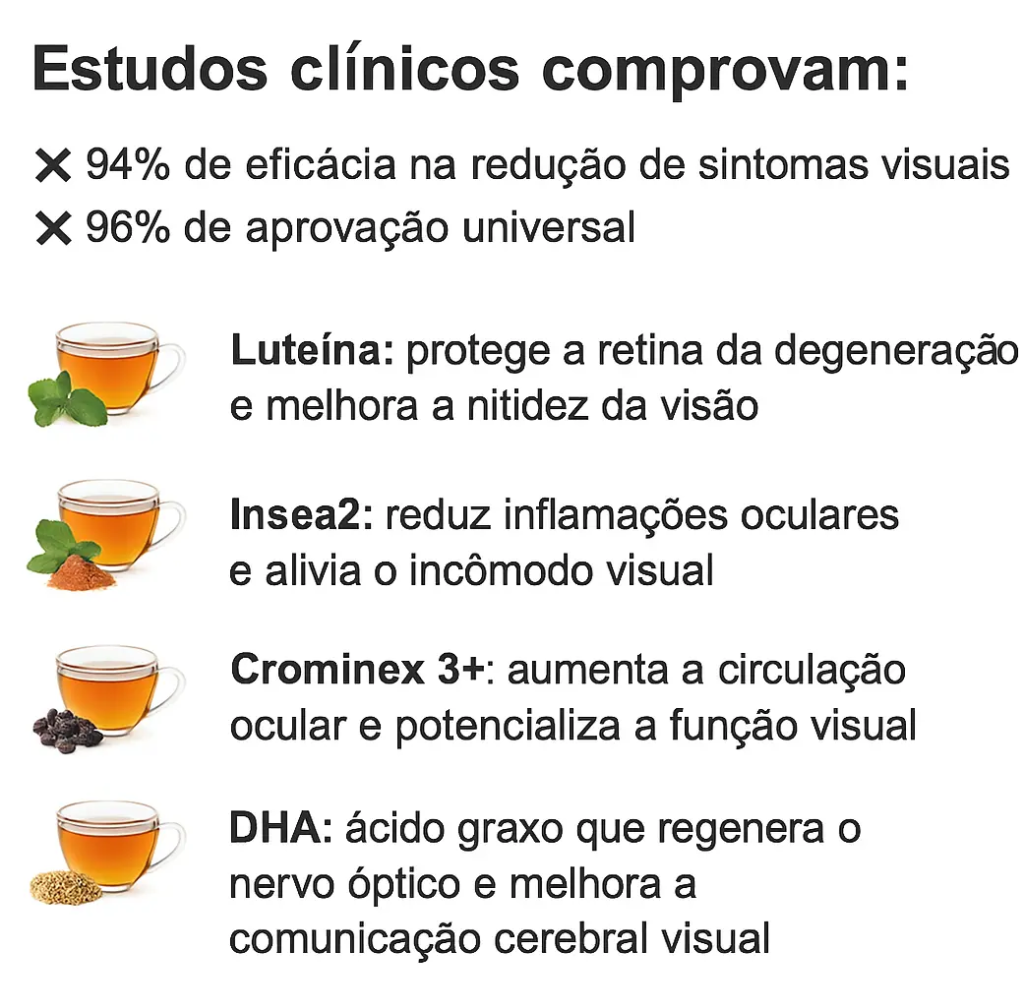 Os ativos naturais presentes nessa fórmula — como a Luteína, Insea 2 e Crominex 3+ — reduzem até 96% dos sintomas visuais relacionados ao glaucoma e à catarata, sem causar efeitos colaterais.